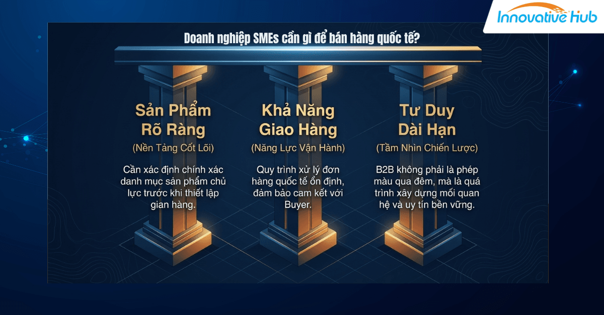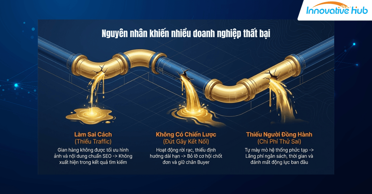 Thay vì chỉ dừng lại ở việc thiết lập nền tảng, Innovative Hub hướng đến việc tối ưu toàn bộ quá trình bán hàng quốc tế. Bắt đầu từ xây dựng gian hàng đến phát triển chiến lược vận hành và mở rộng thị trường.